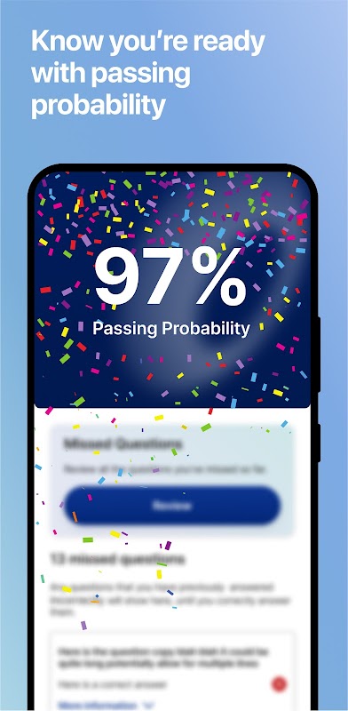 Uygulamamızın tescilli Geçme Olasılığı özelliği, RN NCLEX sınavını geçme olasılığınızı tahmin eder. Sınav sonuçlarınıza ve deneme sınavlarınıza dayanarak, gerçek sınava girmek için ne zaman yeterince hazır olduğunuzu tam olarak bileceksiniz.