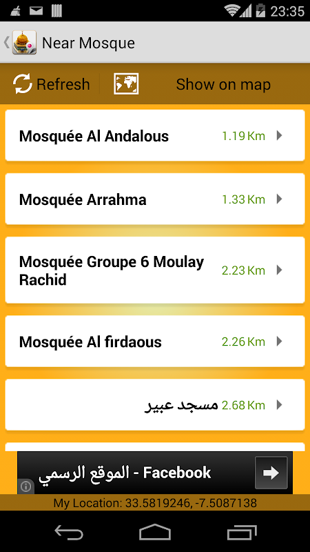 Cevap "Camiye Yakın" uygulamasıdır, Google haritalarına dayanır ve size en yakın camileri size en yakın üstten en uzak 5 Kilometre yarıçapında sıralı bir liste halinde gösterir.