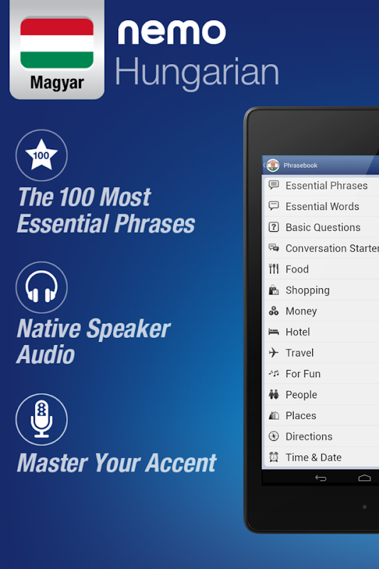 Nemo hemen ve güvenle Macar en yararlı kelimeleri konuşmaya başlarlar için tasarlanmıştır. Dünyanın dört bir yanından indirme milyonlarca, Nemo artık Android telefonlar ve tablet için kullanılabilir.