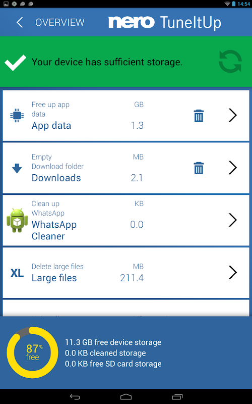One-tap to speed up your device, free storage, or delete private traces. Nero TuneItUp is the cleanest cleaner and booster!