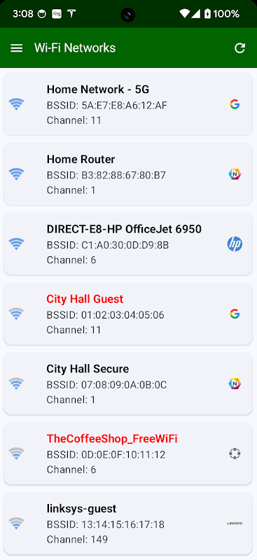 1. Wi-Fi ağları taraması (dinamik bir sinyal gücü grafiği dahil)