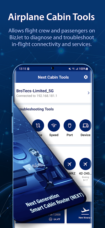 Kabin Araçları, uçuş sırasında WiFi ve uydu internet sağlık ayrıntılarını yakalar ve güncel durum ve sorun giderme araçları için destek temsilcisine veya ekibe sunar.