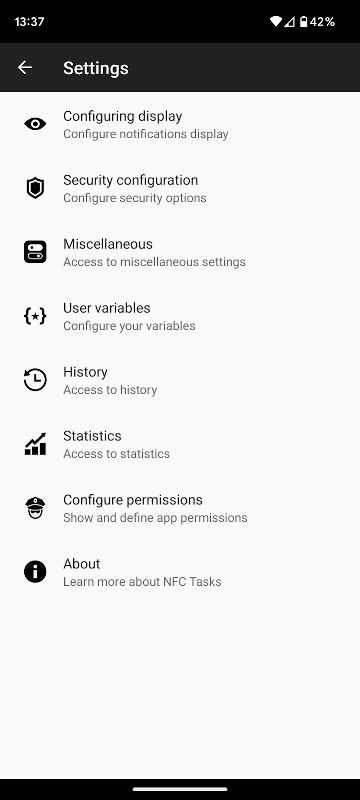 Uygulama, görevlerinizi yürütmenin yanı sıra kullanıcı değişkenleri, izinler, güvenlik ve bildirim seçenekleri ve daha fazlası gibi birkaç ayarı yapılandırmanıza olanak tanır.