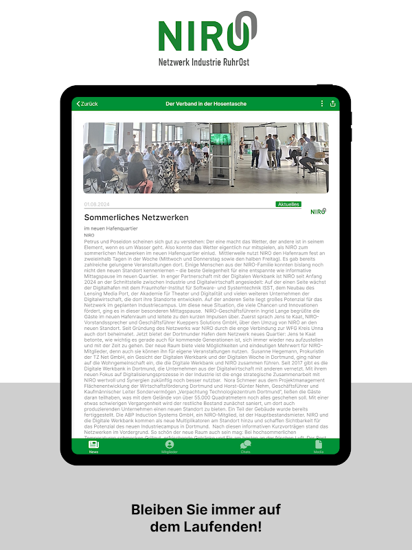 Das Netzwerk Industrie RuhrOst e. V. (NIRO) 2006 yılında Ruhr-Ost Bölgesi'nde Metall- und Industrieelektronik'in şubesi olan Maschinenbau ile birlikte çalıştı ve teslim edildi. Çok sayıda malzeme ve malzeme değişiminden, "Bilgisayar Ürünleri", "Zusammen Arbeiten" ve "Gemeinsam Einkaufen" gibi birçok üründen yararlanın. Hinzu, Dortmunder Hafen'deki Endüstri Kampüsü'ndeki Veranstaltungsraum'da Vereinsleben'i kullanıyor.