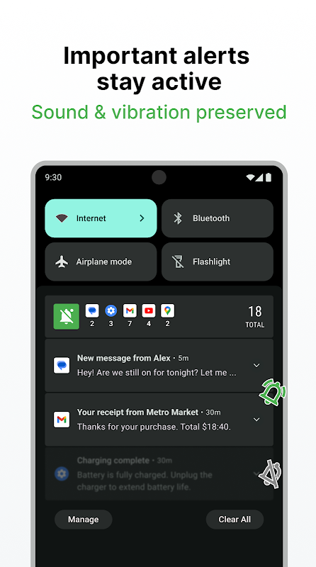 Bildirimleri uygulamaya göre filtreleyin, önemli uyarıları gruplandırın ve dikkat dağıtıcı unsurları atlayın. Belirli uygulamaları önemli olarak ayarlayarak durum çubuğunuzda sesli ve titreşimli olarak saklayın. Ekranınızı karıştırmadan diğerlerini otomatik olarak düzenleyin. Favorileri işaretleyin, önemli bildirimleri sabitleyin ve en önemli olanları bulun.