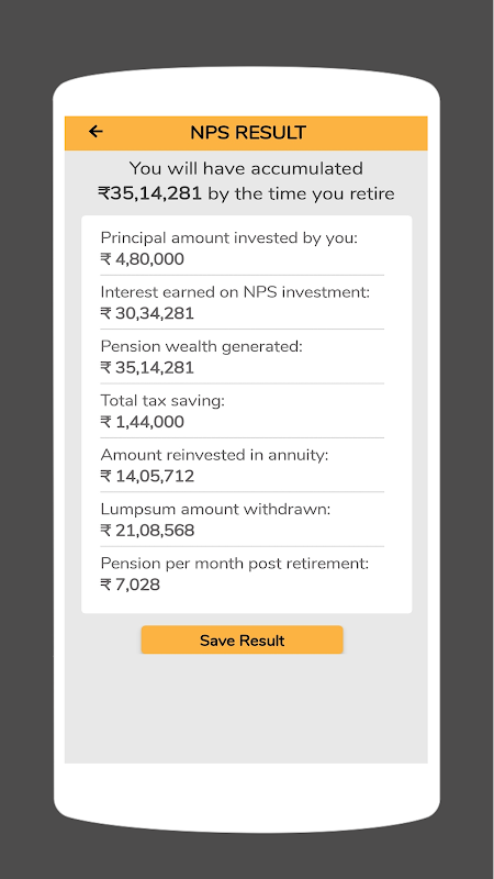 NPS hesaplayıcısı size yatırımınızın ayrıntılarını gösterecektir. Planın birikim aşamasında yatırdığınız tutarı, kazandığınız faizi ve vade anında üretilen toplam korpus miktarını size gösterecektir.