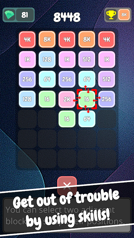 Merge the same number blocks to create bigger numbers and earn points. Start from 1 and see how far you can go!
