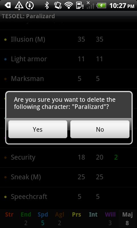 2. Skill list: you can increase a skill if you tap on the row of it, you can go back in history if you press menu button and choose "Undo", you can delete your character if you press menu button and choose "Delete character" option.