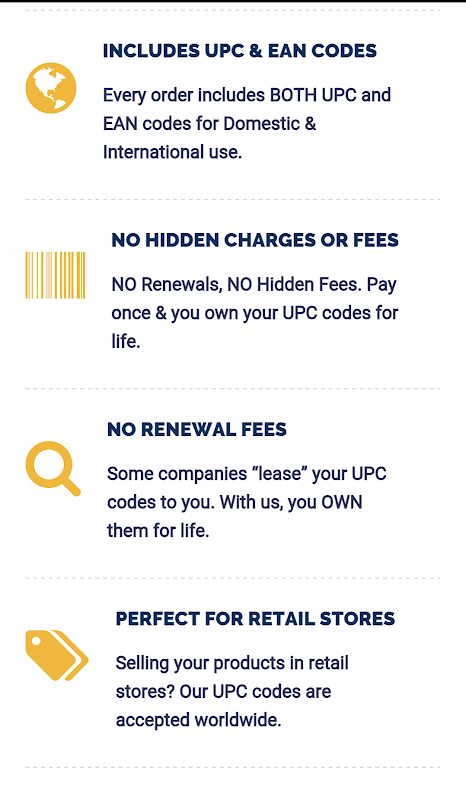 We are extremely competitive with our pricing. The chances are if you find UPC codes cheaper than us, they are not legitimate. If you find UPC codes for sale at lower prices than ours, make sure to check that they are an active member at the Authentic UPC Registration Directory. We HIGHLY recommend staying away from “auction site” UPC codes as these are fly-by-night companies. You can be rest-assured that we will be here for years to come if you ever have questions or need assistance.
