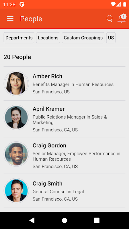 - Ada, departmana, konuma, unvana ve uzmanlığa göre aramalar dahil olmak üzere çalışan dizinini kullanarak iş arkadaşlarınızı bulun ve onlarla bağlantı kurun.
