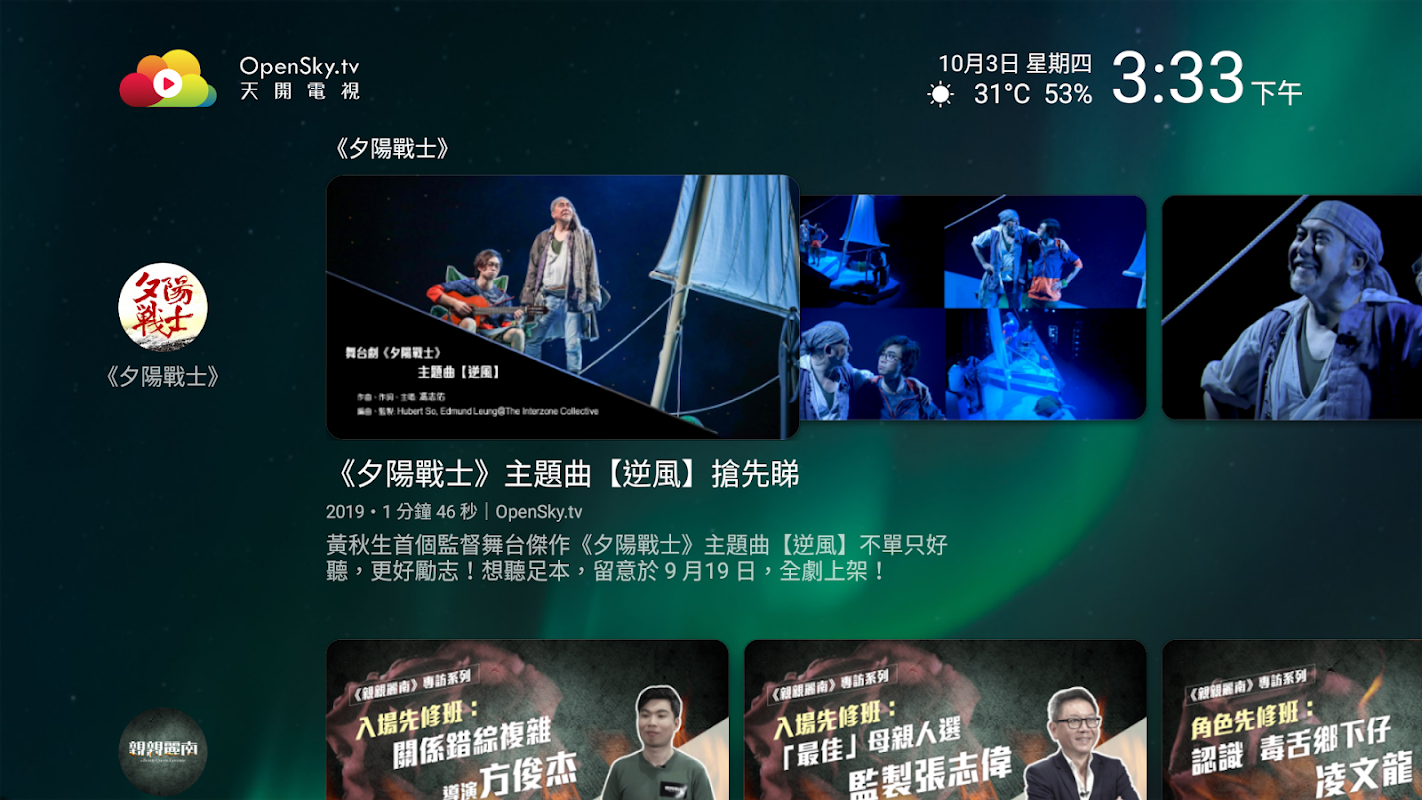 OpenSky破天荒與舞台劇界合作,打造全港首個舞台劇視頻平台,致力推廣戲劇文化。我們積極搜羅優質戲劇作品,為舞台劇迷提供最全面劇訊。同時,為提供更豐富及多元化內容推介,OpenSky亦會繼續精選娛樂盛事,讓本地及全球觀眾同步欣賞高質素的視頻直播及點播,配合智能內容推介技術,帶來嶄新跨平台地域的視聽娛樂新體驗!