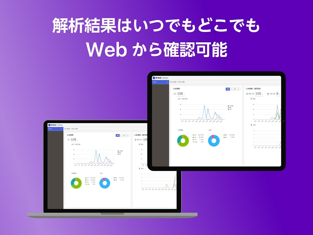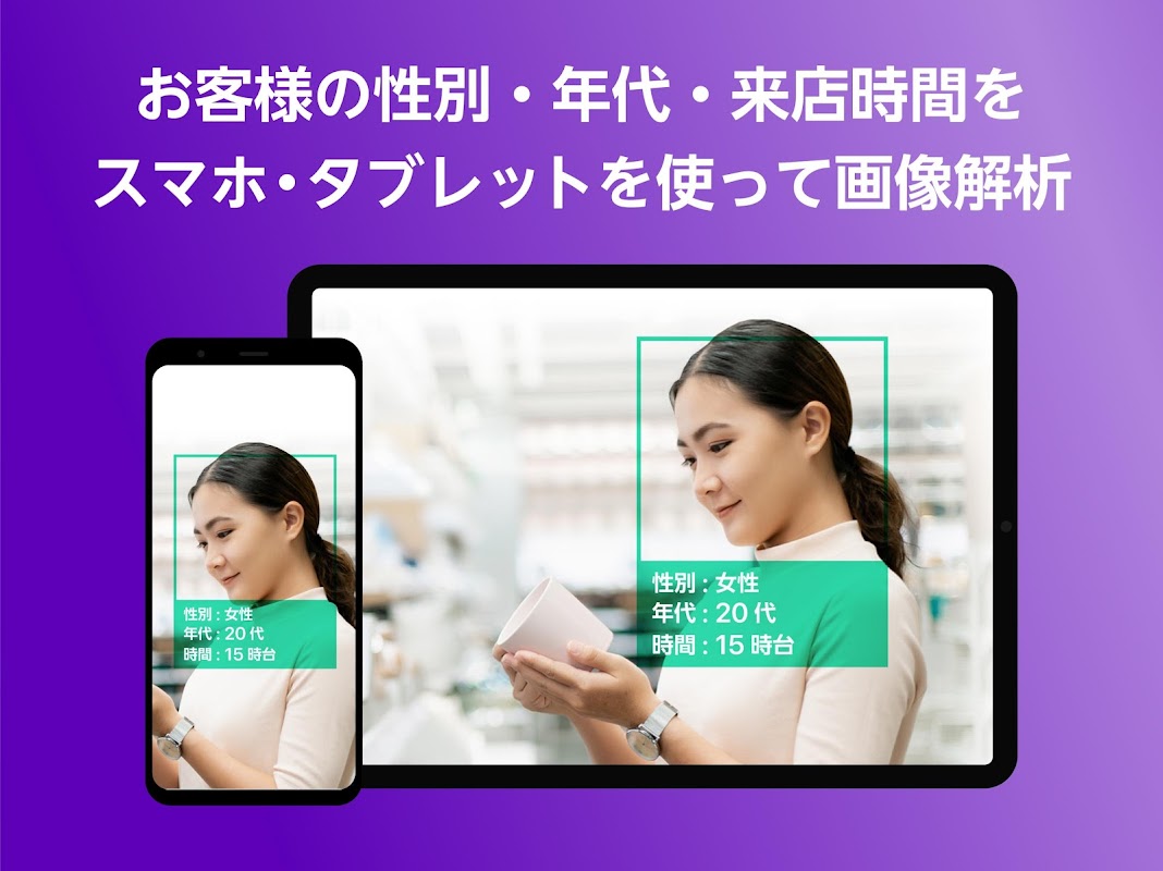 スマホ・タブレット端末を使って始められるAI画像解析サービスです。 インカメラに映った人物の年齢・性別・人数のデータを取得し店舗の業務改善にご活用いただけます。