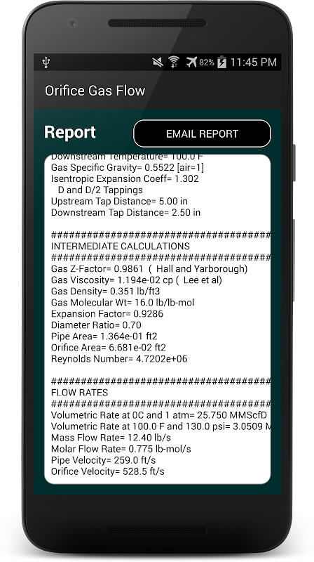 hesaplama sonuçlarının SI / eğe birimlerinde gösterildi. Bu uygulama, standart 60F koşulları ve SI birimleri için saha birimleri ve 0C için 14.7 psia ve 1 atmosfer basınçta hacimsel gaz akış hızını hesaplar. boru ve delikten boru yukarı koşullar, kütle akış hızı ve hızlarda hacimsel gaz oranı da hesaplanır. ara hesaplamalar, aynı zamanda Reynolds sayısı, delik katsayısı, gaz Z-faktör ve gaz viskozite gibi, referans olarak gösterilmektedir. Daha detaylı ara değerler metin yalnızca raporunda görüntülenir. birimleri "Değiştir Birimleri" butonuna tıklayarak alan ve SI birimleri arasında geçiş yapılabilir.