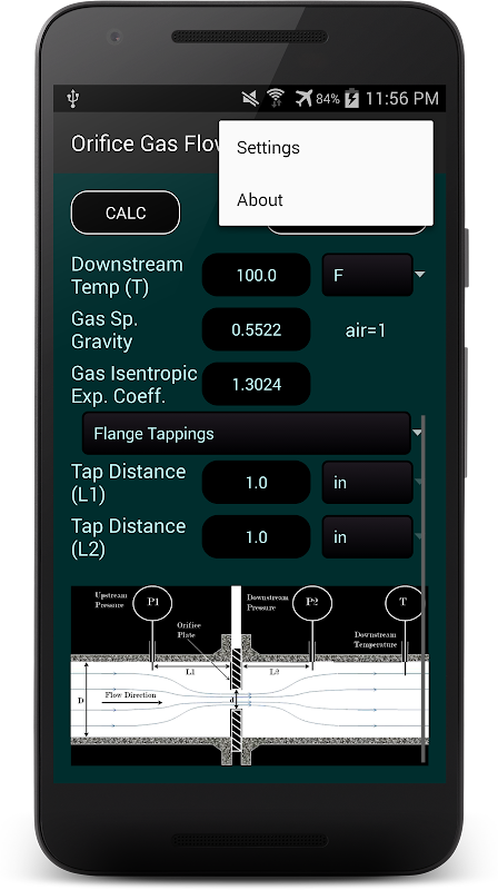 Bu uygulama boru çapı (D), delik çapı (d), yukarı basınç (P1), ağzın (P1-P2), aşağı sıcaklık (T) diferansiyel basınç, gaz özgül ağırlığı ve gaz izantropik genleşme faktörü / ısı gerektirir kapasite oranı (k = Cp / Cv). kullanıcının her üniteleri belirterek seçeneği vardır, dolayısıyla değerler birimlerinin herhangi karışımı olabilir.