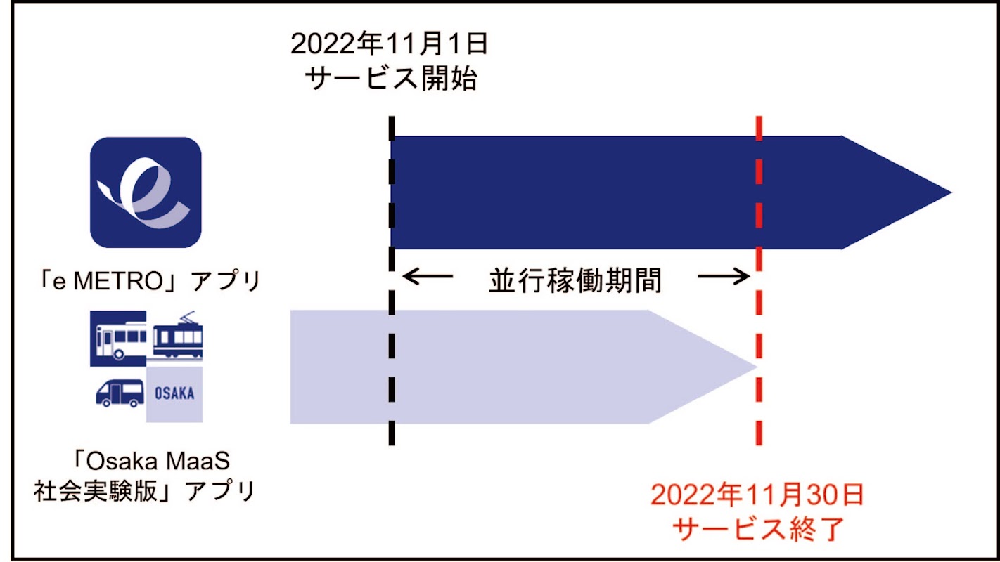 “Osaka MaaS Sosyal Deneysel Versiyon” (Osaka MaaS Sosyal Deneysel Versiyon) uygulaması 30 Kasım 2022 tarihinde hizmetini sonlandırmıştır.
