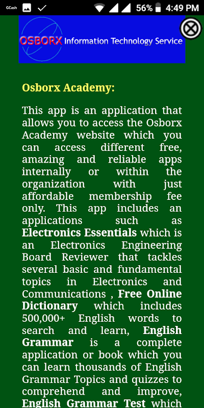 This app is an application that allows you to access the Osborx Academy website which you can access different free, amazing and reliable apps internally or within the organization with just affordable membership fee only. This app includes an applications such as Electronics Essentials which is an Electronics Engineering Board Reviewer that tackles several basic and fundamental topics in Electronics and Communications , Free Online Dictionary which includes 500,000+ English words to search and learn, English Grammar is a complete application or book which you can learn thousands of English Grammar Topics and quizzes to comprehend and improve, English Grammar Test which is a learning app that contains basic to advanced level practices to help you learn the grammar as impressively as possible. You will find 200+ topics with grammar details, a lookup dictionary, 1200+ questions, and an explanation for each question in this English grammar exercise app, Basic English Grammar which embraces the most important, significant, and useful basic topics in English that you will be cultivated and discovered to enhance your English ability and skills, English Grammar Book which includes English Tenses in a simplest presentation, learn it once and remember it for life time and this app will provide you some outstanding facilities to learn English grammar tenses with practice, English for All which is an application that lets you learned English vocabulary the fastest way ever and this app is comprises of 10000 items multiple choice practice test that you will ultimately experience in a different way of learning and it will help you improves your English vocabulary whether for writing, speaking, listening or reading, English Words is an application which you can learn thousands of English Vocabularies and pronunciations and it will help you a lot in developing and understanding those words correctly and use effectively, and many more apps to enjoy.