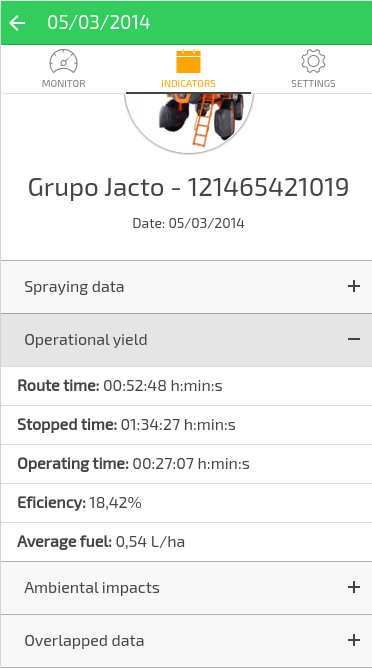 • Indicadores - Verifique as operações realizadas por sua máquina Jacto, com informações do percurso percorrido, cobertura e sobreposição da pulverização.