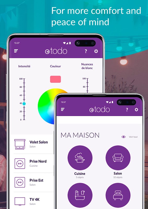 Otodo çözümü, akıllı evinizle etkileşim olanaklarını artırarak Akıllı Ev deneyiminizi kolaylaştırır: bu mobil uygulama, aynı zamanda ses asistanları ve bağlı düğmelerle de. Otodo çözümü, önceden kurulmuş olan bağlı cihazları evde kolayca keşfetmeyi ve eşleştirmeyi sağlayan kolay bir eşleştirme sistemi içerir.