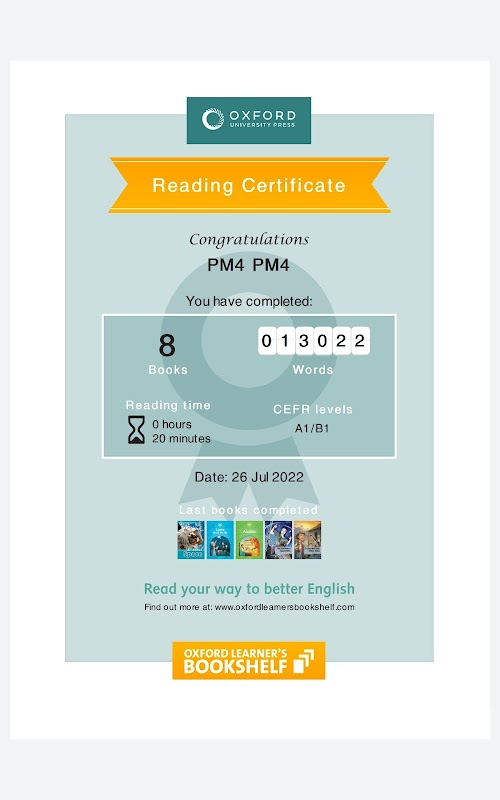 Classic Tales, Oxford Read and Discover, Dominoes, Oxford Bookworms, Oxford Read and Imagine ve Totally True dahil olmak üzere kurgu, kurgu dışı ve peri masalları. Okuma ödülleri toplayın ve okuduğunuz kelime ve kitap sayısını okuma günlüğünüzde paylaşın ve arkadaşlarınızla, ebeveynlerinizle ve öğretmenlerinizle paylaşacağınız bir sertifika alın.