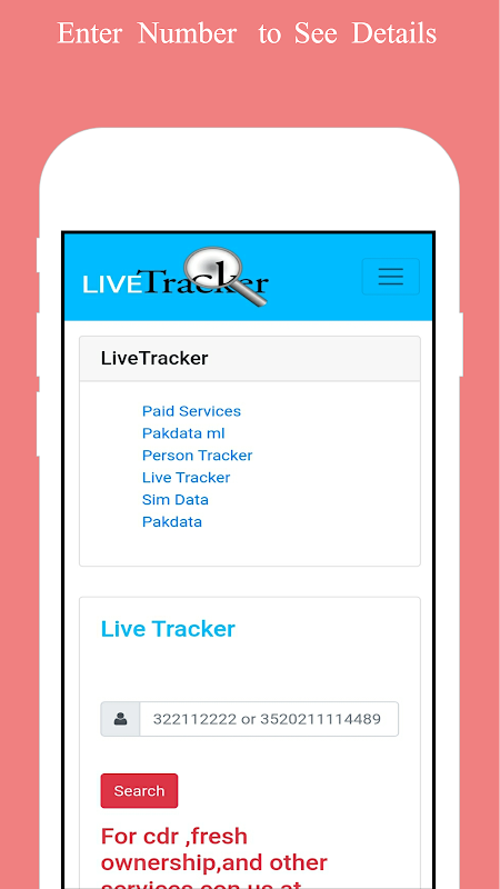 If you need to get data of any number, you can use the Pak E Services Pak Sim Data app for this. With Pak E Services Pak Sim Data you can get details of any number. You can know any CNIC details like name address and everything about the person by the help of Live Tracker App.