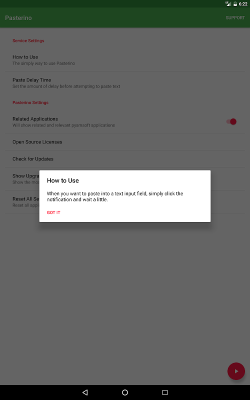 Pasterino requires an Accessibility service to assist users with disabilities by allowing them to easily paste content into input fields. Pasterino does this by searching through the current open screen and pasting clipboard content into the currently focused input field.
