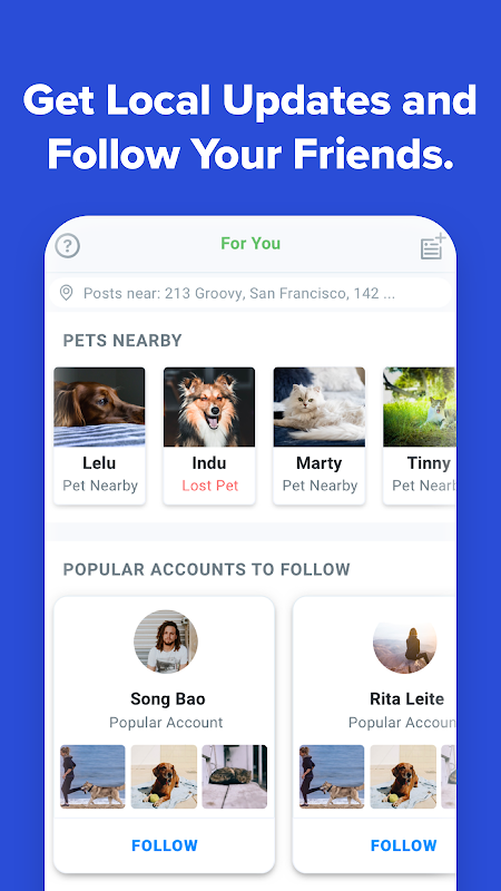 Pawscout’un sosyal araçlarıyla yerel evcil hayvan severler ağınızı kurun. Fotoğrafları paylaşın, yürüyüşler ve oyun alanları düzenleyin ve komşuları evcil hayvan tehlikeleri veya evcil hayvan dostu yerler konusunda uyarın. Arkadaşlarınızı ve ailenizi “evcil hayvanınızı” genişletmeye davet edin