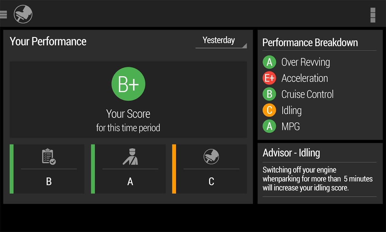 - Sert hızlanma ve yavaşlama dahil Performans puanına katkıda Puanlama elemanları; aşırı devirli; rölanti; kabotaj; cruise control kullanımı; sert frenleme; hız; Fren kullanımı; ve sert viraj.