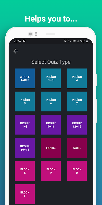 Ve eğlenceli kısım için, periyodik tablo hakkındaki bilginizi ölçmek için bir sınava girebilirsiniz. Periyodik tablonun hangi bölümünü test etmek istediğinizi seçebilirsiniz. Veya en üst düzey zorluk için tüm masayı deneyebilirsiniz. Bu küçük sınavlar, elementleri ve atom numaralarını ezberlemenize yardımcı olacaktır.
