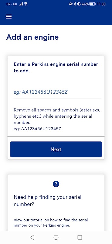 Perkins® My Engine Uygulaması, Perkins motorunuzun bakım, servis ve onarımını ücretsiz olarak mobil cihazınızda veya tabletinizde desteklemenin kolay bir yoludur. İster tek bir Perkins motoru sahibi olun ister Perkins tarafından desteklenen makinelerden oluşan küçük bir filonuz olsun, bu uygulama size servis zamanının geldiğini bildirir ve Kullanma ve Bakım Kılavuzu'na ve motorunuzun üretim listesinin yedek parça kitabına hızla erişmenizi sağlar.