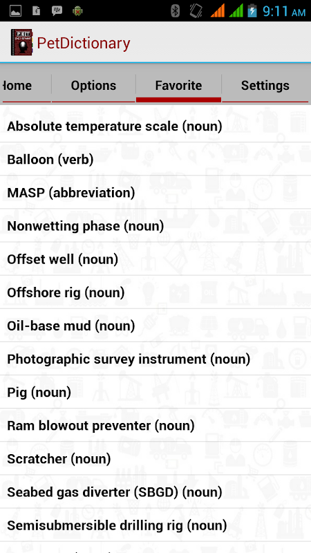 The Petroleum Dictionary is the primary source of reference for all those interested in the oil and gas industry. With over 8,000 words and counting, the Petroleum Dictionary serves as a potent source of knowledge base for both technical and non-technical individuals. Simply install, open and wait a few seconds for the Petroleum Dictionary to initialize.