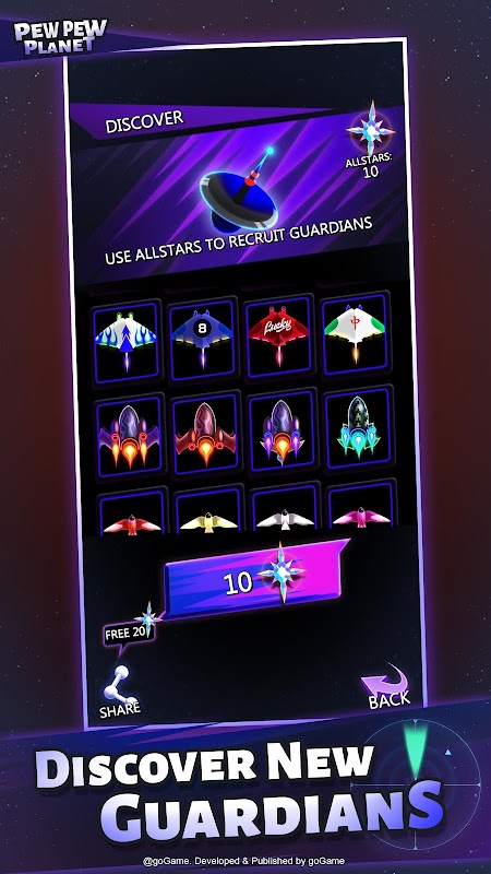 30'dan fazla eşsiz Vasiyi keşfedin! Allstars'ı kullanarak yeni Guardians alın! Güç vermek için özel ganimet vur! Boomerangs ve güçlü Lazer ışınları gibi özel mermi vur! Pew Pew Bar'ınızı şarj ederek hızlı ateş Hiper Moduna girin!