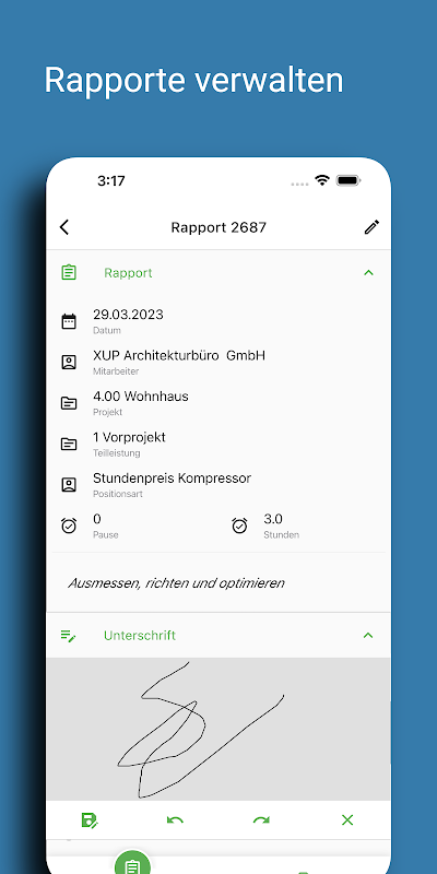 Proffix için pfx performansı, Proffix'te performans kaydına yönelik modern bir uygulamadır. Raporlar hareket halindeyken kaydedilebilir, düzenlenebilir ve hatta imzalanabilir.