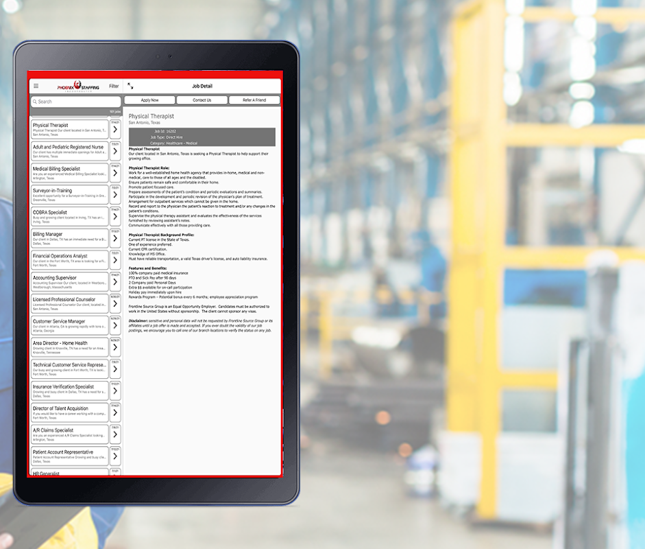 Phoenix Staffing uygulamasıyla bağlantıda kalın. Hareket halindeyken işleri arayın, görüntüleyin ve başvurun.