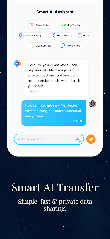 Hız, gizlilik ve sadelik için tasarlanan Smart Transfer, uygulamaları, fotoğrafları, videoları, kişileri, mesajları, belgeleri ve yedeklemeleri tek bir dokunuşla taşımanıza yardımcı olur. Bağlantı için Wi-Fi veya Hotspot kullanın; internet, kablo veya hesap gerekmez. Her şey cihazlarınız arasında kalır ve adım adım rehberlik için yerleşik yapay zeka aktarım asistanımız tarafından desteklenir.