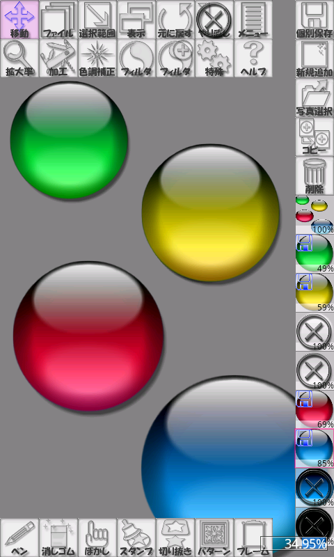 ■画面右の画像アイコンを上下にスライドで、画像の重なりの上下を入れ替え。
