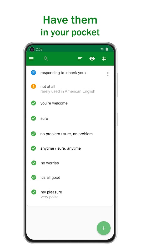 Phrasebook, özel bir uygulama, cümleleri yazıp cebinizde bulundurmanıza olanak tanıyan etkili bir dil öğrenme aracıdır.