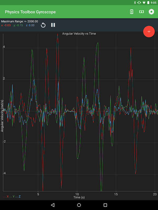 This app measures and displays a graph of Angular Velocity (rad/s) vs. Time (s) that can be exported to Google Drive or in an e-mail as a .txt attachment with comma separated values (csv). This gyroscope can be used to measure rotational and/or periodic changes in the x, y, and z planes.