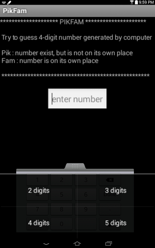 Oyunun karmaşıklığını menüden seçebilirsiniz - 2, 3, 4 veya 5 haneli sayı.