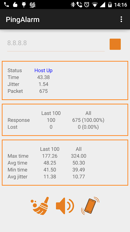 How it works: PingAlarm sends 2 packets every second and shows you all statics it collects