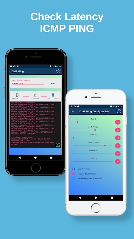 ICMP Ping uygulaması, telefonunuzdan veya tabletinizden ping komutlarını çalıştırmak için basit ve temiz bir ağ aracıdır. Bu, IPv4 veya IPv6 adresleriyle bir ping komutu çalıştırabileceğiniz veya uzak bir sunucunun ana bilgisayar adını kullanarak kullanabileceğiniz bir Ping aracıdır. Daha ileri düzey kullanıcılar için ping komutuna aralık, ICMP paket boyutu, paket sayısı, TTL ve daha fazlası gibi ek parametreler ayarlayabilirsiniz.