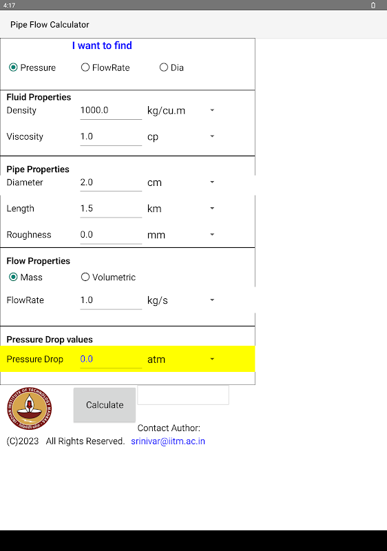 Bu uygulama türbülanslı akışta sürtünme faktörünü hesaplamak için Colebrook örtülü denklemini (ve laminer akışta Hagen Poisuelle denklemini) kullanır. Bunu basınç düşüşünü VEYA akış hızını veya boru çapını hesaplamak için kullanabilirsiniz. Bu, Newton tipi bir sıvı ve silindirik bir boru varsayar.
