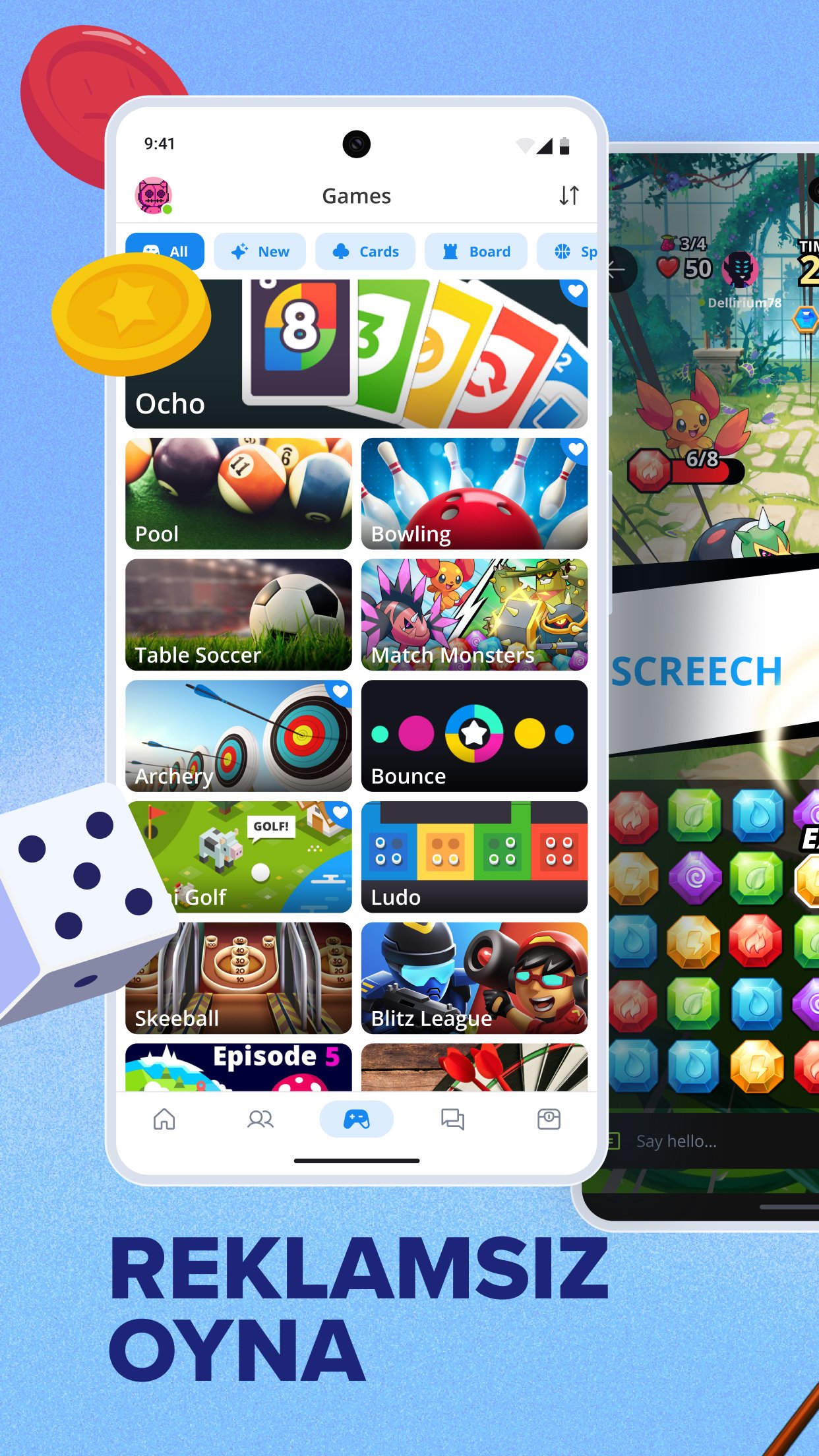 - Çok Sayıda Oyun: Ocho (Çılgın Sekizler), Bilardo 🎱 ve Langırt ⚽ gibi en popüler 50 çok oyunculu oyun sayesinde her zaman oynayacak eğlenceli bir şeyler bulabilirsin. İster strateji, ister spor veya klasik masa oyunları olsun aradığın her şeyi bulabileceğinden emin olabilirsin.