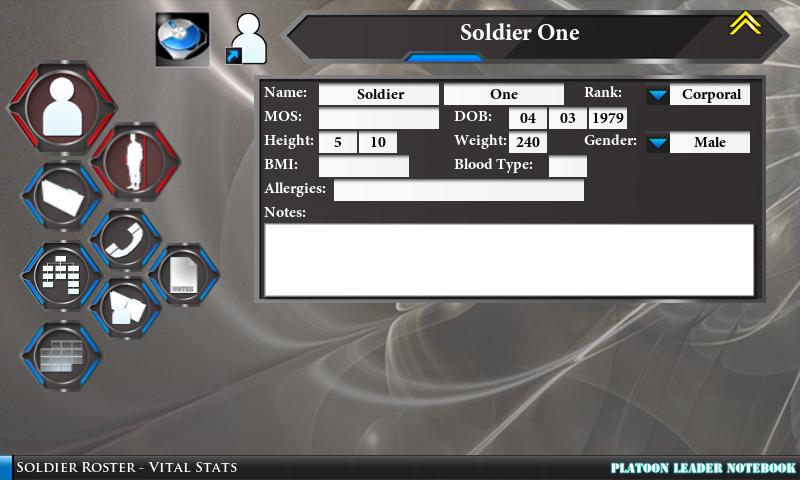 This application allows a platoon leader to organize a variety of information about their squad on hand in their phone.