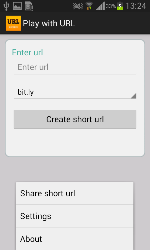 Kullanıcı, Uygulama URL kısaltması için bit.ly ve tinyurl.com'u seçebilir ve elde edilen bağlantıyı, Facebook veya twitter gibi herhangi bir paylaşım Uygulaması aracılığıyla telefonunuzda paylaşmanıza olanak tanır.