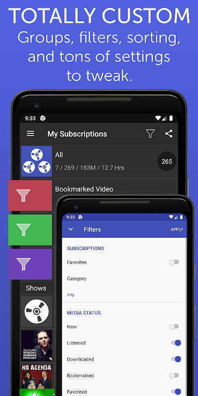 İçeriği Abonelik (Sık Kullanılanlar, Kategori), Medya Bayrakları (Yeni, Dinlenmiş, İndirilmiş, Sık Kullanılanlar, Favori), Medya Türü (Ses, Video, Metin) ve Siparişe Göre (Artan, Azalan) göre filtreleyin. Daha hızlı erişim için filtreleri Gruplara kaydedin.