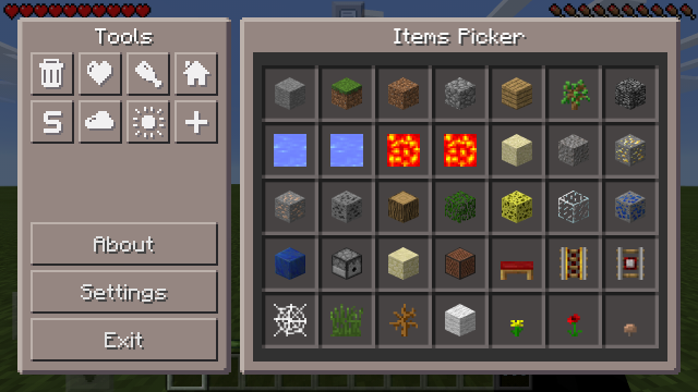 GUI Yöneticisi Pocket çok kolay ve kullanımı sezgisel. Sağ tarafta, envanter Minecraft Pocket Edition dünyada var tüm blokları ve öğeleri içerir. Eğer MCPE bazı öğeleri ekler bir mod yüklediyseniz Ayrıca, - onlar da bu envanterde görünecektir.