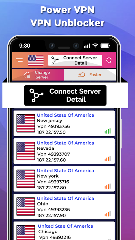 Power VPN-VPN Unblocker app has unlimited access to unblocking sites from worldwide with your device. now it's easy to keep safe your mobile IP address while you are want to access other countries sites to unblock any sites or many more from your mobile device. use this application with better Internet without a username, without any password or also without any little registration process.