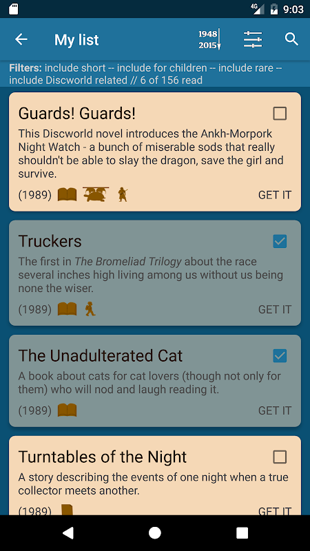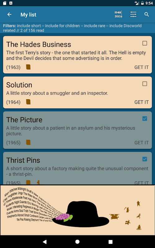 Sen çocuklara ve genç yetişkinler için hikayeler, nadir eserler artık yeniden basıldı ediliyor kısa hikayeler eklemeyi seçebilir veya isterseniz listeniz Discworld bağlı öğe içerecek şekilde. Öğeleri okumak veya basitçe onları daha az highlighed yapmak ve alfabetik veya yayın yılına göre öğeleri sıralamak gizlemek için daha fazla olabilir.