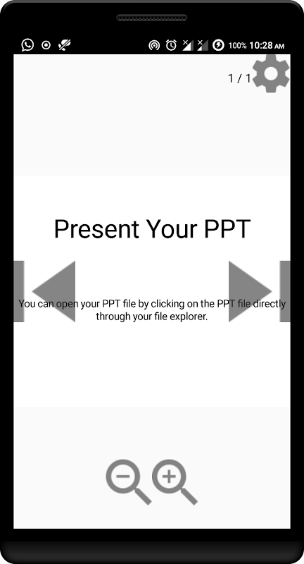 Kişisel PPT uygulaması sunun, hareket halindeyken bir akıllı telefondan PPT dosyalarını açmak sağlar. Kullanıcıların tam genişlik ve yükseklik onların PPT dosyalarını zevk sağlayan tam ekran özelliğini destekler. Üzerine tıklayarak ve Kişisel PPT uygulaması Mevcut seçerek dosya gezgini doğrudan PPT dosyalarını açın. Orada in / out yakınlaştırma gibi çeşitli diğer yararlı özellikleri ve hareketleriyle kendini diğer slaytlar arasında gezinmek.