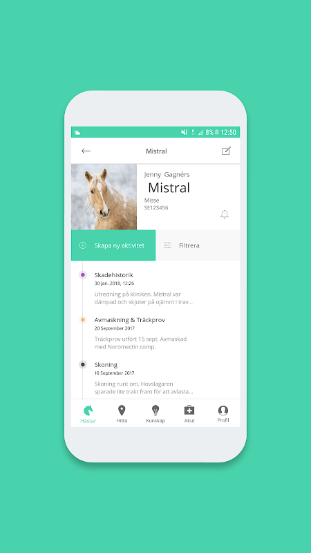 Genom att smidigt dokumentera hästarnas vardag i kalendern får du och hästens team överblick över aktiviteter och detaljer kring hästens hälsa och utveckling. Allt sparas på en tidslinje vilket gör det enklare att upptäcka om något är fel och när det började.